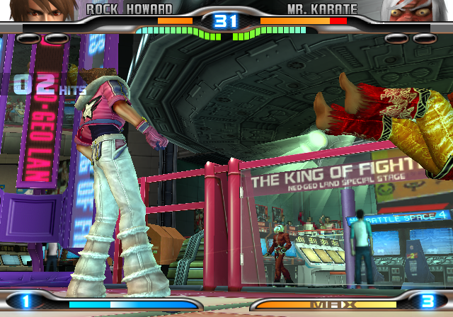 The King of Fighters first included a stage in front of Neo Geo World in the 1995 iteration, and you can vaguely make out an arcade machine through the windows. The second Maximum Impact game (misleadingly titled The King of Fighters 2006 in the US) revisits this stage and even has a variant for fighting inside. It looks more like an amusement park than a game center, but you can spot a few arcade machines in the far background, and there might even be some carboard SNK characters in front of them.