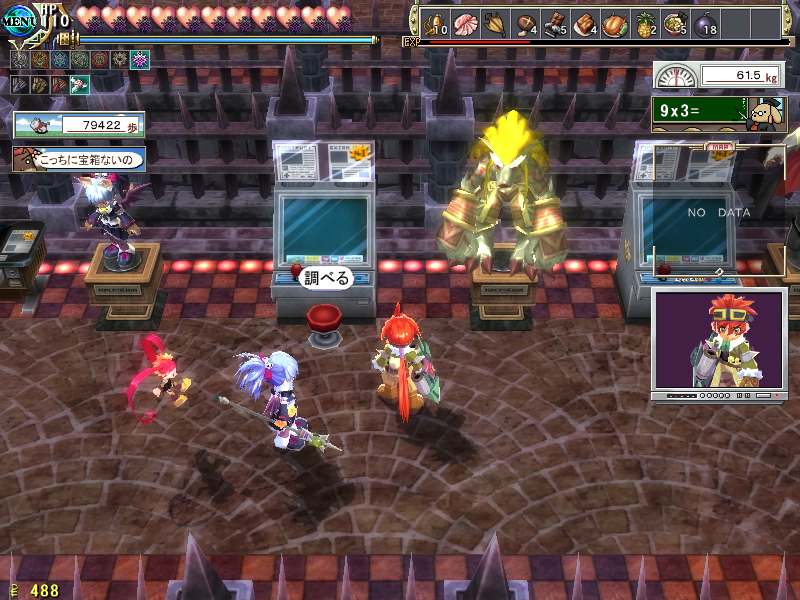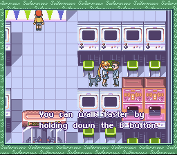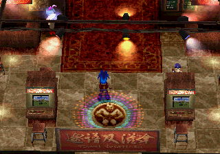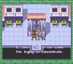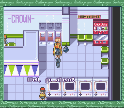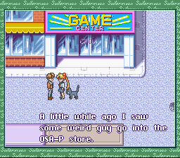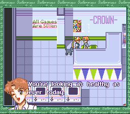 In the sole Sailor Moon RPG, Usagi Tsukino finally gets to stroll around Game Center Crown at leisure, disturbing a desperate guy at the UFO catcher and getting tutorial info from a bunch of other players. Unfortunately, she still can't play "Sailor V" and the only exciting thing about the interior is the lettering on the walls literally proclaiming "EXCITING!"