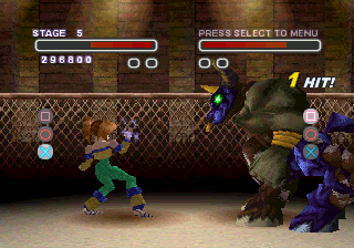 Legend of Legaia is essentially Sony's attempt to nab a piece of the sweet, sweet Final Fantasy VII pie, so some parallels to that game are not surprising. Sol Tower could be described as a poor man's Gold Saucer, featuring various amusement opportunities. The Muscle Dome is dedicated to arena matches, but in its entrance arena, there are two arcade machines with the game "Baka Fighter". In Japanese, that means "Stupid Fighter", and the game is pretty stupid. It's styled like a fighting game where you can choose between the three main characters and fight various monsters from the game, but it only consists of rock-paper-scissor type matches where you press one of three buttons and watch whether your choice beats the opponent's to chip away a chunk of their health. The first few enemies almost always do the same action, but they continuously grow stronger and more randomized as you beat them.