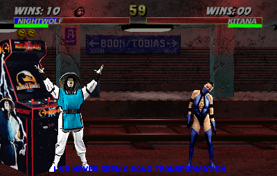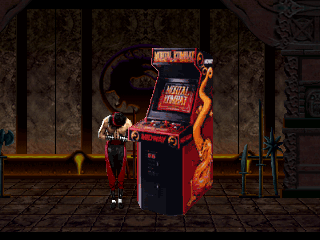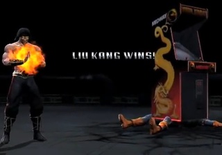 While there is no joy and therefore no arcades in the Netherrealm, by the third game Liu Kang has learned to always bring a Mortal Kombat machine with him - to squish his opponents under with a fatality. Nightwolf also summons a Mortal Kombat II machine in his Friendship move in Ultimate Mortal Kombat 3, while transforming himself into Raiden. The move was phased out when the series made its transition to 3D, but made a return when Midway was in need of PG-13 compatible fatalities for Mortal Kombat vs DC Universe.