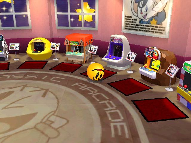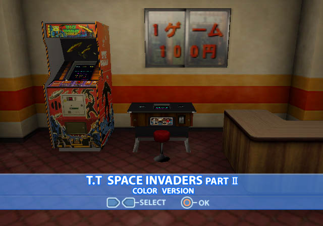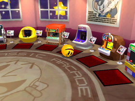 What could be a more self-suggesting menu for an arcade game compilation than a virtual game room? Technically this started with the C64 budget compilation Arcade Classics, where you'd select one of four arcade game clones on a menu screen of arcade machines, but the concept was first fully realized with the Namco Museum series. True to the title, these drop you in a virtual museum with lots of exhibits related to the featured games, of course including a model of the original cabinet, which you can walk up to and play. Namco Museum Encore has the most machines from that era, but here they are just floating in outer space. Namco abandoned the approach in many of the later titles, but Namco Museum Remix for the Wii has an arcade where all the original versions are available, while the remixes take place in amusement park style standalone attractions. Taito's Space Invaders Anniversary collection also takes place in an Invader Room full of neatly arranged machines of the classic's various versions. More recently, Midway Arcade on the iOS App Store follows a similar template.