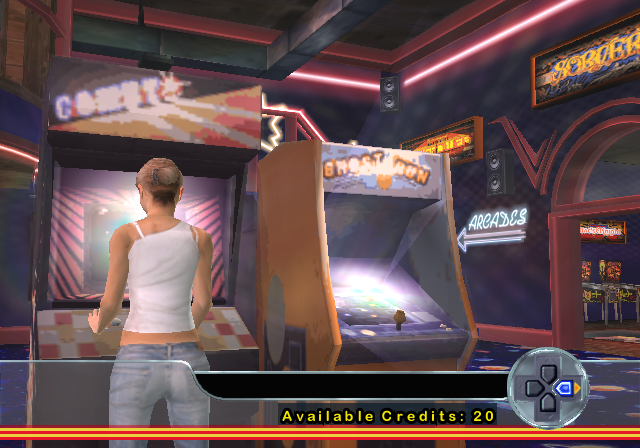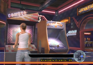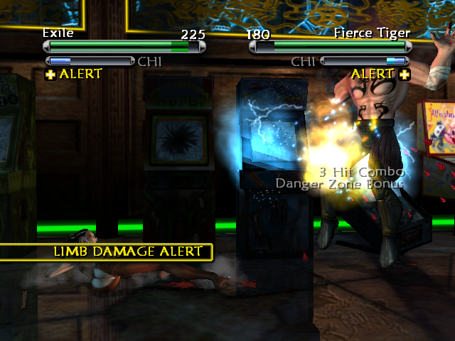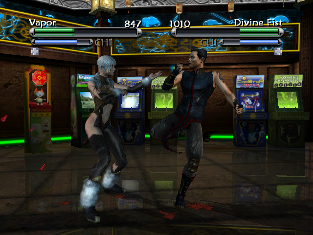 Tao Feng: Fist of the Lotus also features an arcade stage with a lot of different titles that actually have gameplay screen texures, albeit these are not animated and not very detailed; a golf game "Grass Hole 2003" an early-'80s style maze or platform type game "Simplax Herbi", "Women's Gymnastic Trivia", the harder to identify "Copstar 2094" and "Tsui Nami", alongside a bunch of pinball tables. All of the machines get destroyed with bright sparks when a combatant is smashed into them.
