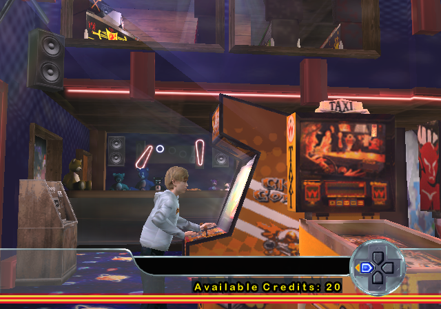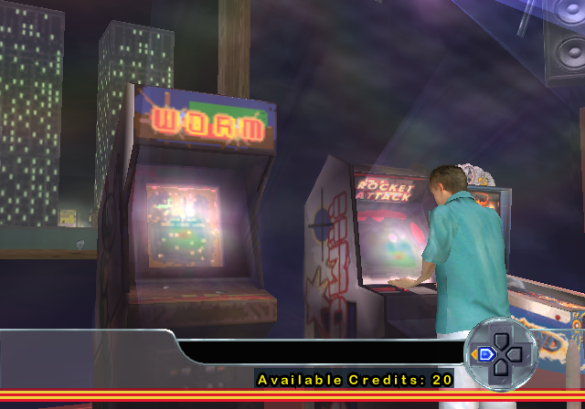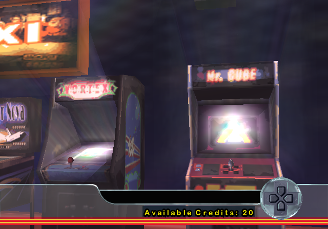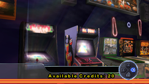 Pinball Hall of Fame: The Gottlieb Collection is a compilation of pinball tables that are also selected from a virtual arcade. In between the pinball tables are various other amusement machines as decoration, including arcade cabinets that are very obviously based on Missile Command, Asteroids and Q*bert, but with all the titles replaced by unintelligible graphical elements (Q*bert was actually a Gottlieb game, but the rights for it went to Columbia). There is also a machine labeled "Mojo!", which was a puzzle game for PlayStation 2 and Xbox by the same publisher/developer combo, Crave Entertainment and FarSight Studios. Maybe there were some legal issues with the all too obvious imitations of trademarked arcade machines, as all of them were removed from the later PSP and Wii versions.