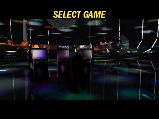 Even though it is not a game compilation, Star Wars Rogue Squadron III: Rebel Strike allows unlocking the classic Star Wars arcade game trilogy either via secret codes or by completing specific missions. This adds a new menu that takes you to a hangar as Darth Vader, where you can walk up to the machines and select them as you'd select vehicles in the virtual hangar of the main game. Similarly, Project Gotham Racing 3 has two playable Geometry Wars cabinets in the virtual garage menu. The older Flight Unlimited features an arcade machine in its walkable 3D menu as well, but here it isn't playable.