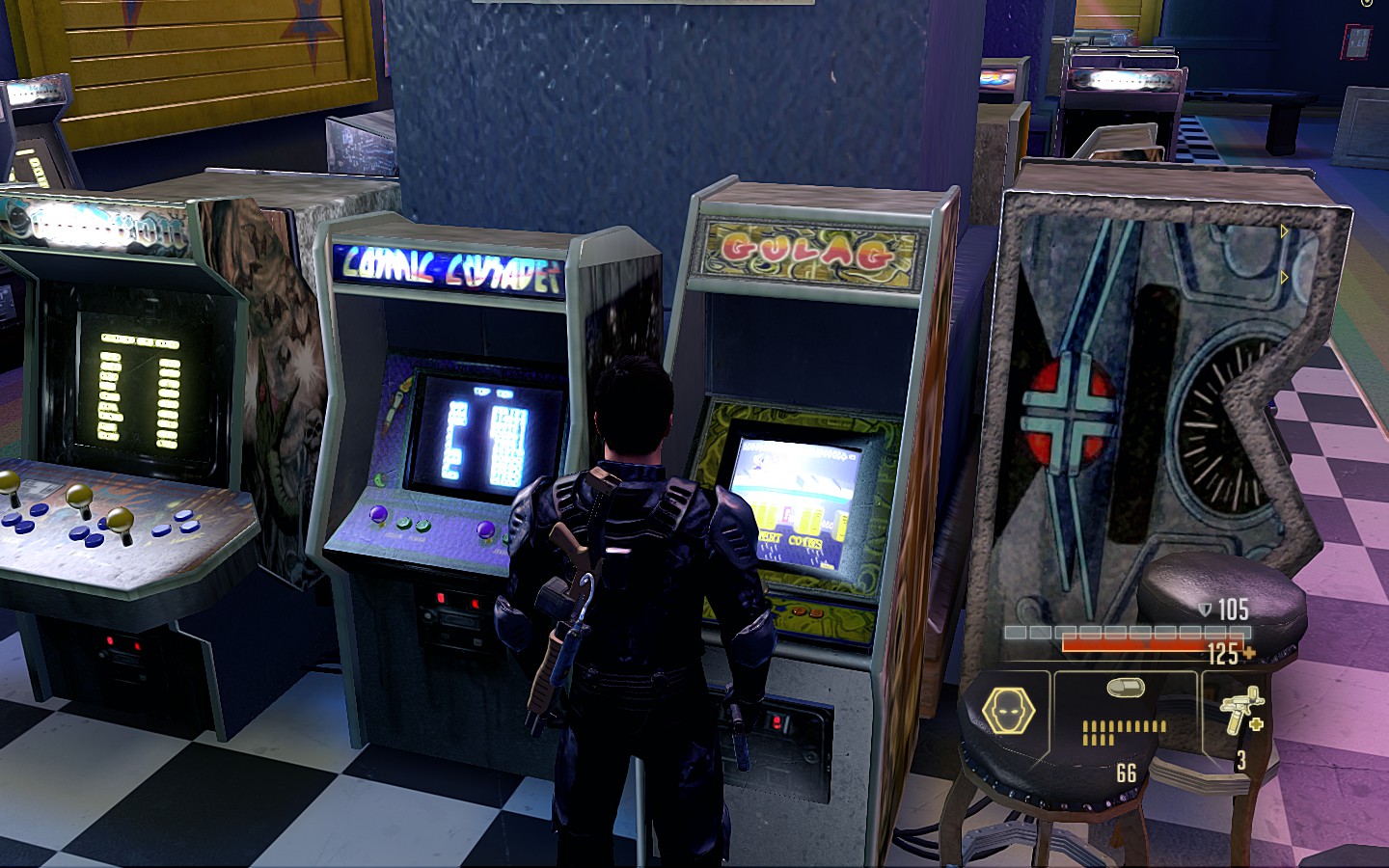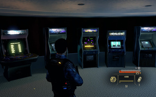 In the course of your fight against a conspiring arms manufacturing conglomerate in Obsidian Entertainment's innovative espionage action RPG, you take on a Russian crime boss and infiltrate his yacht. And what does every self-respecting Russian crime boss need on his yacht, besides hookers, booze and cocaine? Exactly, his own swimming video game arcade. All the machines have 8-bit style game mockups on their displays, but unfortunately none of them is playable. Then again, we're not sure if we would want to play a game titled "Gulag"...