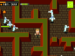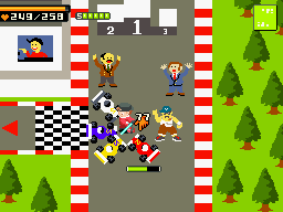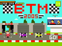 Contact styles itself as kind of a parody on JRPGs, with ludicrous bezel stickers that give you power and a character in the game frequently addressing the player directly, over the head of the protagonist. One of its areas is Habara, a play on Tokyo's famous nerd Mecca Akihabara. Here, the hero happens upon two arcade machines, which he must enter to get through their 8-bit worlds. The first is a racing game named "BTM 2005", where he wins not by getting to the goal ahead of everyone else, but by smashing all the cars in the race. Next is Dragon and Dragon an RPG-ish arcade action game like Tower of Druaga or Dragon Buster, complete with overhead and sidescrolling segments.