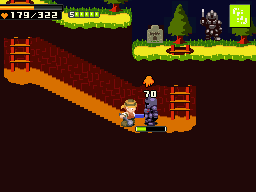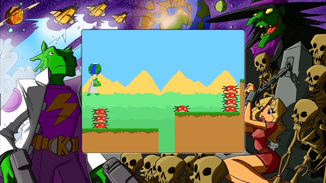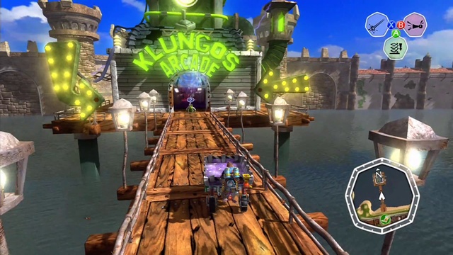 Former henchman Klungo has settled down and opened up shop in Klungo's Arcade. You never actually get to set foot inside the extravagant establishment, but you can talk to Klungo at the entrance and he lets you play "Hero Klungo Sssavesss Teh World", an automatic runner platform game with Klungo as the self-insert hero who literally carries around a globe to safety. Klungo isn't much of a programmer though, so the game is pretty bad and tends to crash a lot. Much more impressive is the retro sci-fi style cabinet art. Later, the sequel "Hero Klungo Sssavesss Teh Universsse" became available via DLC.