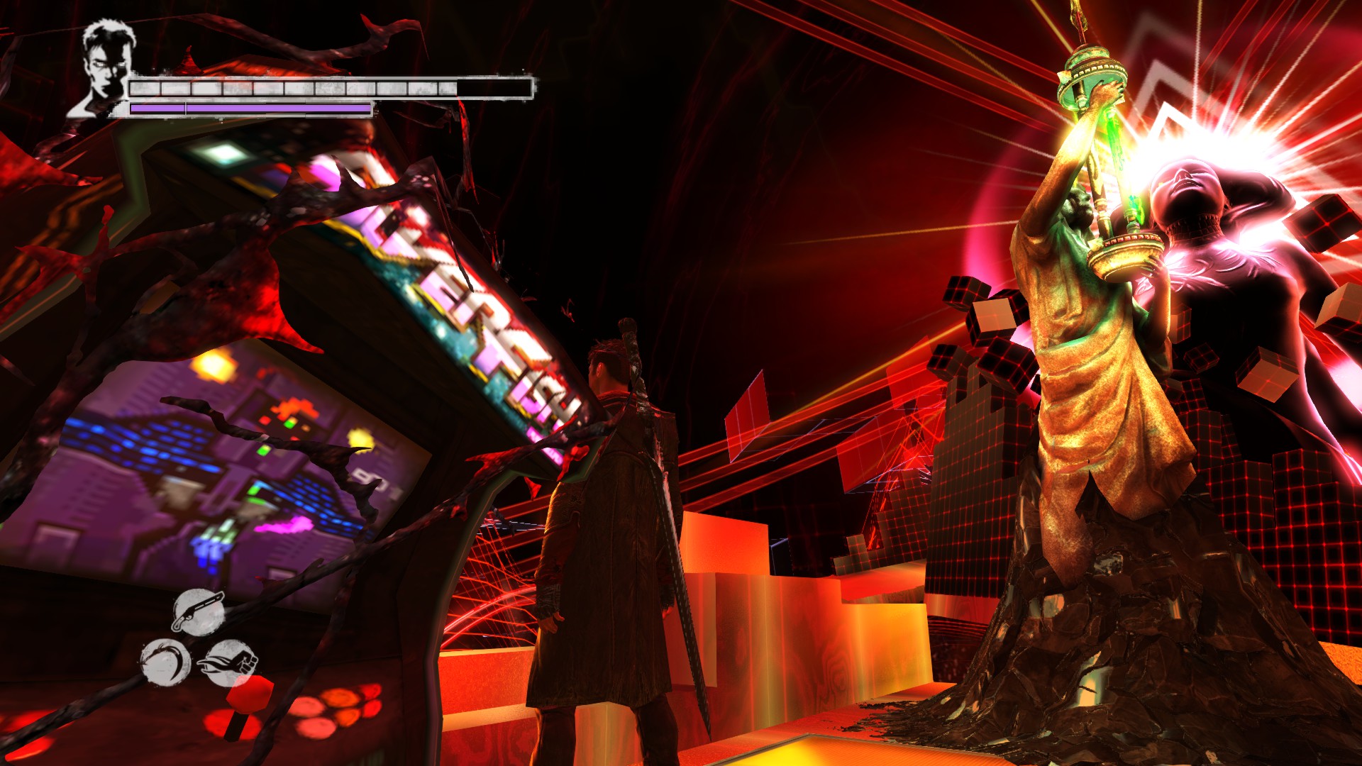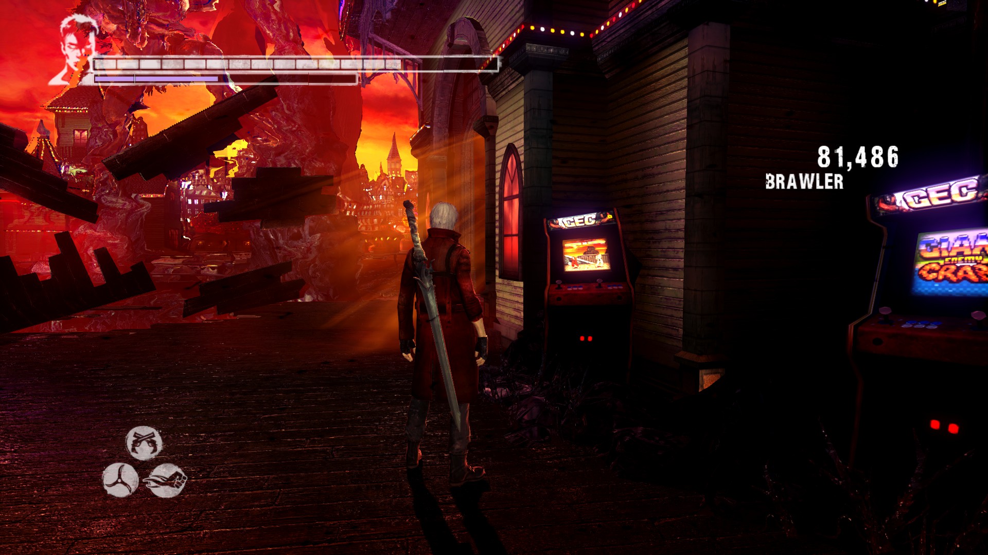 One of the objects that fly by naked Dante in the intro to Ninja Theory's unloved Devil May Cry prequel/reimagining is an arcade machine creatively labeled "Game". Throughout the game, there are a few more arcade cabinets found in the levels. One of them is called "Giant Enemy Crab", short GEC, but some of the screens actually show a scene from Street Fighter II. The other is called "Silverfish" and seems to be a 2D shoot-em-up. Neither of the games can be played, but the cabinets can be distorted by corruptions, making for some funny-looking results.