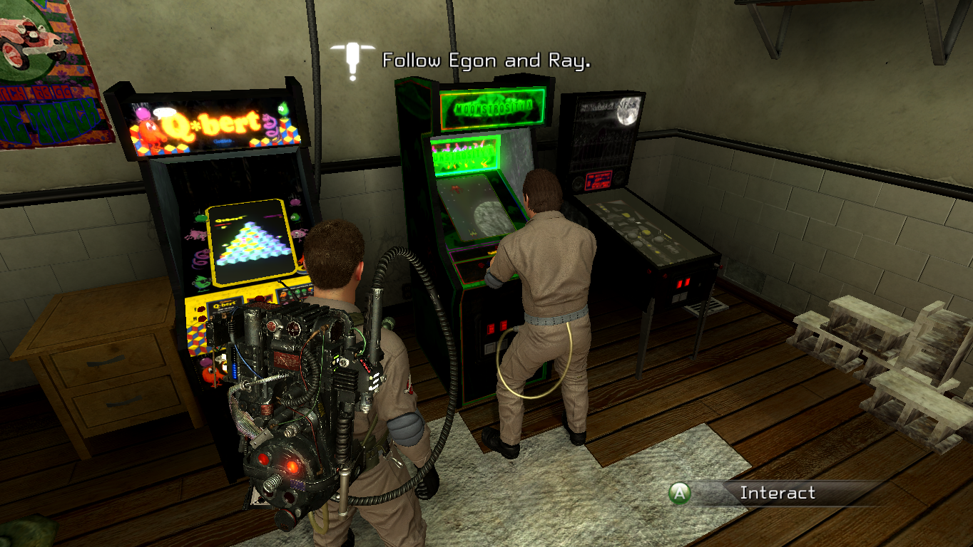 The Ghostbusters have always been playful types. There are arcade machines in their repurposed firehouse even in the movie, but you never get a good look at them. This changes in Terminal Reality's sequel in video game form, where you can freely walk around the HQ in between missions. Tucked in a corner is a faithful recreation of the Q*bert cabinet (owned by Columbia, just like Ghostbusters), next to a shooter called "Monstrosity X" and the pinball table "Strangeness". Sometimes you see the Ghosbusters playing the games, and you can "interact" with the machines as the new recruit, but that only results in him standing in front of the machine pretending to be playing for a while.