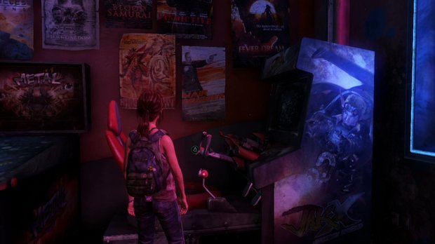 In this side story to The Last of Us, Ellie gets to connect with Riley, her best friend from her former school before the events of the main game. Together, the two manage to get power to the abandoned Raja's Arcade, with titles such as "Triple Phoenix" (with awesome side art of three TNMT cash-in style anthropomorphic birds), "Gobble Boy" or "Baboon Wrench Jeffrey". But the game that has the two girls' attention is "The Turning", presumedly an hyperviolent fighting game a la Mortal Kombat. Unfortunately, though, it is busted like all the other machines. No problem, says Riley, just close your eyes and imagine playing the game! What ensues is one of the most laughable uses of Quick Time Events in a game ever. In a corner Ellie can also find a broken deluxe cockpit cabinet of Naughty Dog's own Jak X: Combat Racing (only released on PlayStation 2 in the real world), where she can sit down and pretend to play once more.