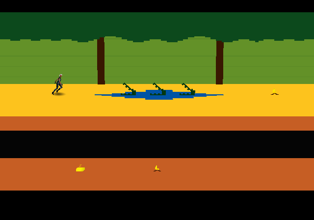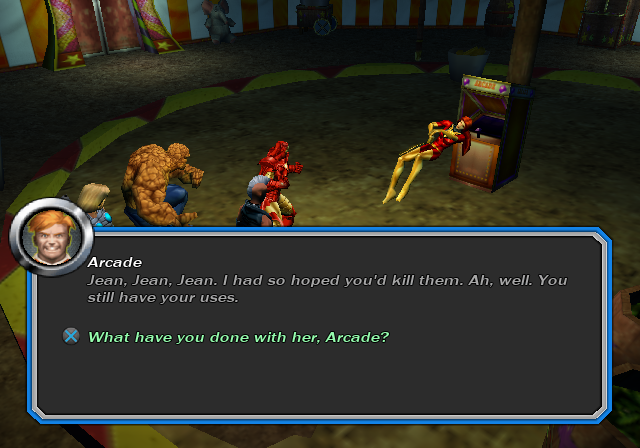 Marvel Comics have a minor but popular villain who's actually named Arcade, so the big Ultimate Marvel mashup brawler should be predestined for this list, no? Actually, Arcade is just a murderous carny for the most part, running a circus full of evil clowns, but that doesn't mean that he cannot mind control Jean Grey and suck her into a Pitfall! cabinet (once again ignoring the fact that it was only released on home systems in the real world) as she fails to kill the team of heroes. The selected superhero then goes after her, and finds herself in the two-dimensional world of the game. The current 3D model is still used instead of the Pitfall Harry character sprite, though, so the physics feel more than a little bit off. The game still has almost all of the features of the original game, including the gold bars, even though they don't do anything as there is no score and you can try as many times as you need. Contrary to the 1982 version, it also has a very limited number of screens. At the end you find Arcade's devilish machine, and destroying it frees both characters from the cabinet.