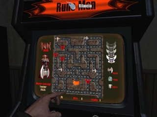 Prey was built on the same technology as Doom 3, but it even goes one step further. The game starts out in a bar area, which is full of actable entertainment screens, from TVs to arcade machines. Most of them are just boring card games or digital slot machines, but you can also try your hands at the Pac-man like Rune Man, which borrows the aesthetics of Human Head Studios' earlier Viking hack-n-slash game Rune.