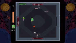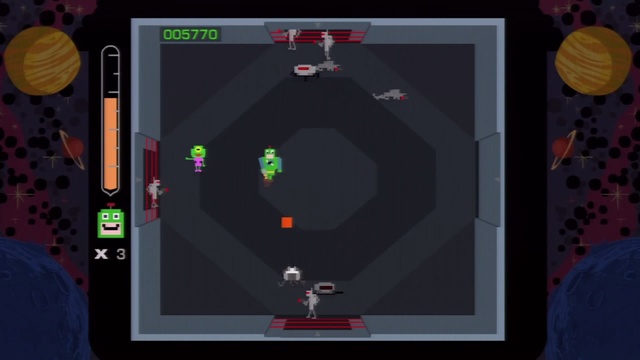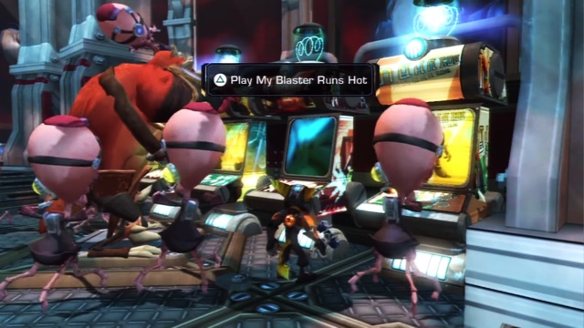 The one free cabinet in the small arcade corner in Ratchet & Clank Future: A Crack In Time runs "My Blaster Runs Hot", a take on the Robotron 2084/Smash TV formula, where you shoot incoming waves of enemies with a two-stick control scheme while rescuing green alien ladies.