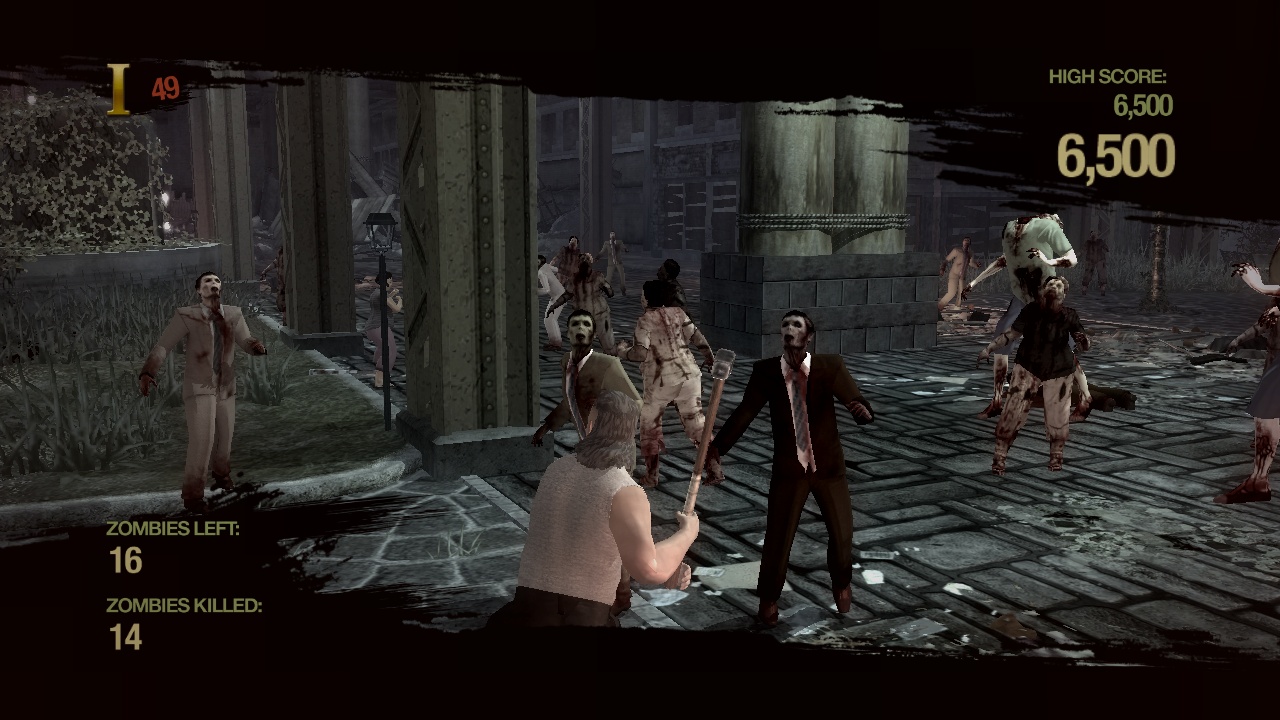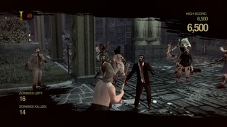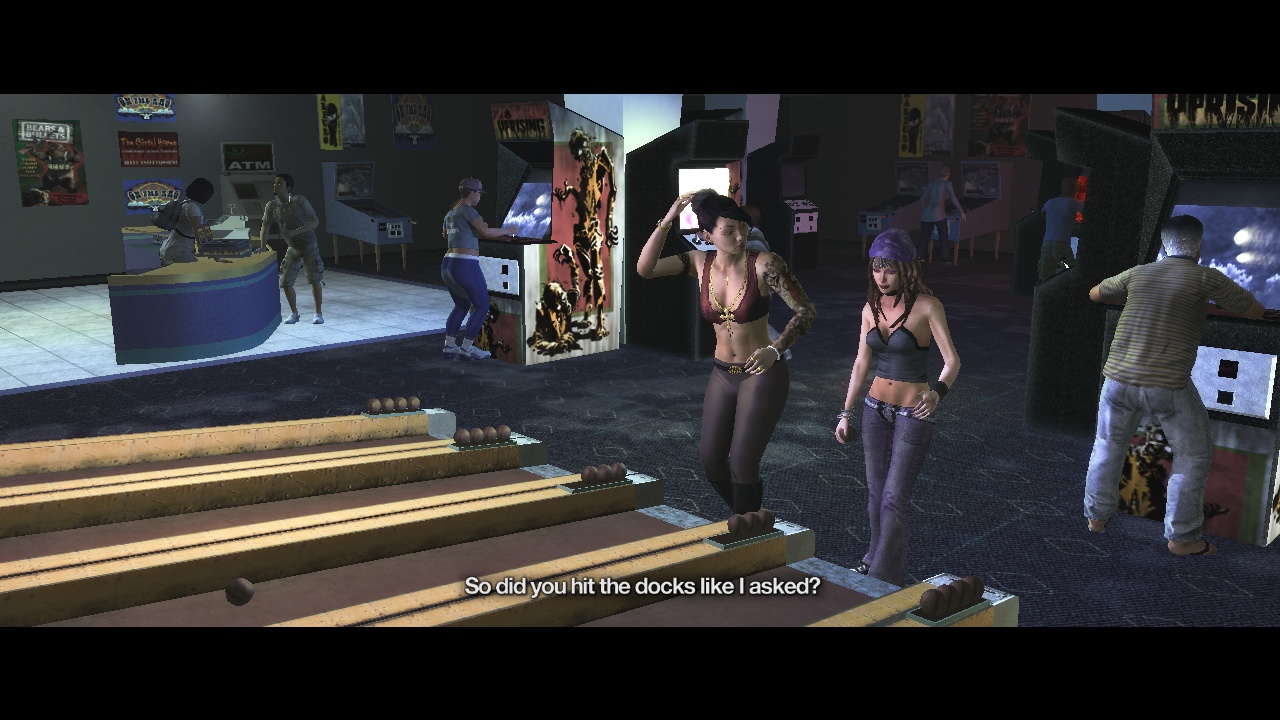 Several bars and night clubs in Saints Row 2 feature an arcade machine called Zombie Uprising, but there's also a dedicated arcade visited in the course of a mission for the Saints. It has ball games, pinball machines and various nondescript video game cabinets, alongside the big title. Other than the arcade games in Grand Theft Auto games, Zombie Uprising is not some mockup '80s style game, but uses the same engine as the main game, only with some annoying filters. In the game, you run around killing zombies, protecting victims and avoid getting eaten. The game also becomes available on a console in the player's cribs. A cabinet for the sequel Zombie Uprising 2 can be found in Saints Row IV, alongside a machine titled Saints Row 3, but they appear to be out of order.
