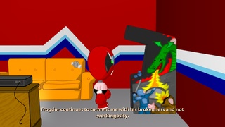 Strong Bad has an arcade cabinet of Trogdor, which was an earlier Homestar Runner flash game from 2003 starring the titular dragon as he wreaks havoc on medieval villages. Throughout most of the game it just stands there broken, but in the final episode it grows Trogdor's legs, wings and starts causing a ruckus. Strong Bad of course has to deal with it, if only so he can play the game again.