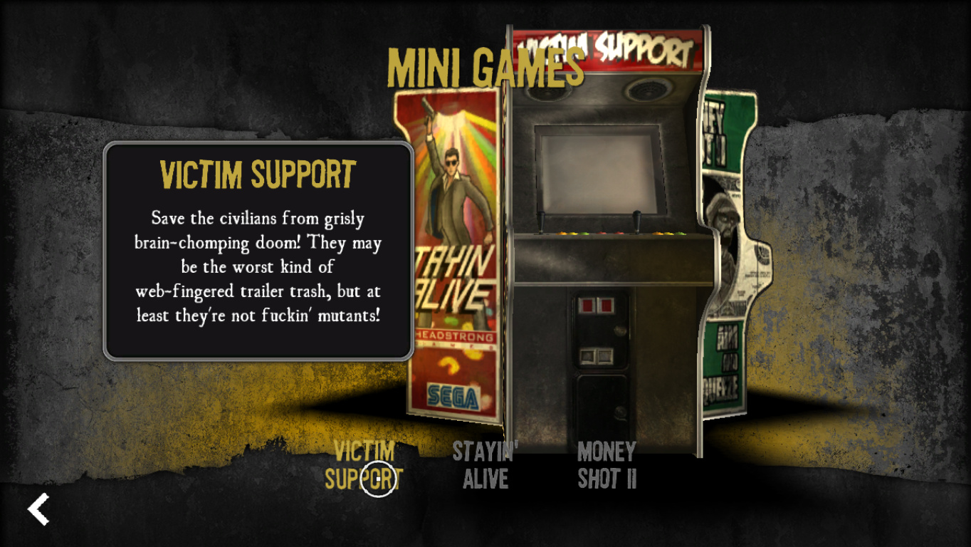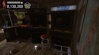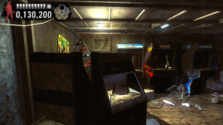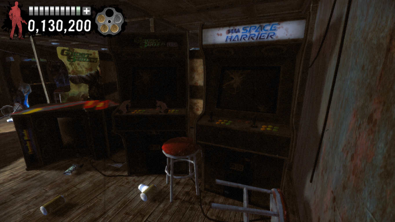 The tongue-in-cheek grindhouse style spin-off of Sega's popular lightgun shooter / typing tutor series features a level called Carny, which is exactly what it says. On their predefined course, the players also go through an old trailer that used to function as a run-down arcade before the zombies ran over everything. It is filled with Sega classics such as Space Harrier, Power Drift, Thunder Blade and Zaxxon, but also Ghost Squad, even though Overkill is supposed to take place in the 1990s. In this case, it's not so bad that they machines are not switched on - who would want to play a game where dead severed hands are still clutching the joysticks? There are also three minigames that are presented as arcade machines in the menu.