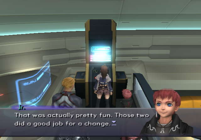 "Hakox" in Xenosaga Episode III can be accessed from multiple locations. One looks more like a computer terminal, but the one in the Elsa cantina is definitely an arcade cabinet. "Hakox" is a fully realized 3D puzzle game with so many levels it could almost have been sold as a standalone title. That's probably why the developers didn't want their work go to waste and actually force you to play the game to progress the story. You don't need to achieve anything, though - just start up the game and then quit eventually.