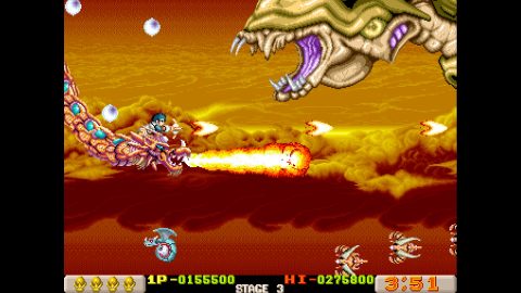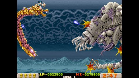 Like X-Multiply, Dragon Breed is one of those R-Type adjacent Irem shooters, which feature unique mechanics to protect your character from harm. Here, it’s the enormous multi-segmented dragon Bahamoot, who is impervious to damage and can protect its vulnerable human pilot Kayus. It’s still a tough game, as you’ll get sent back to an earlier checkpoint when you die, but taking advantage of Bahamoot’s unique capabilities helps even the playing field a bit. In addition to attacking with the crossbow, the dragon can also fire charge shots and has a handful of extra abilities, like raining lightning down from its body.