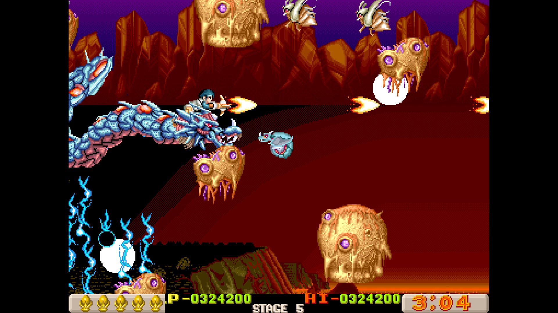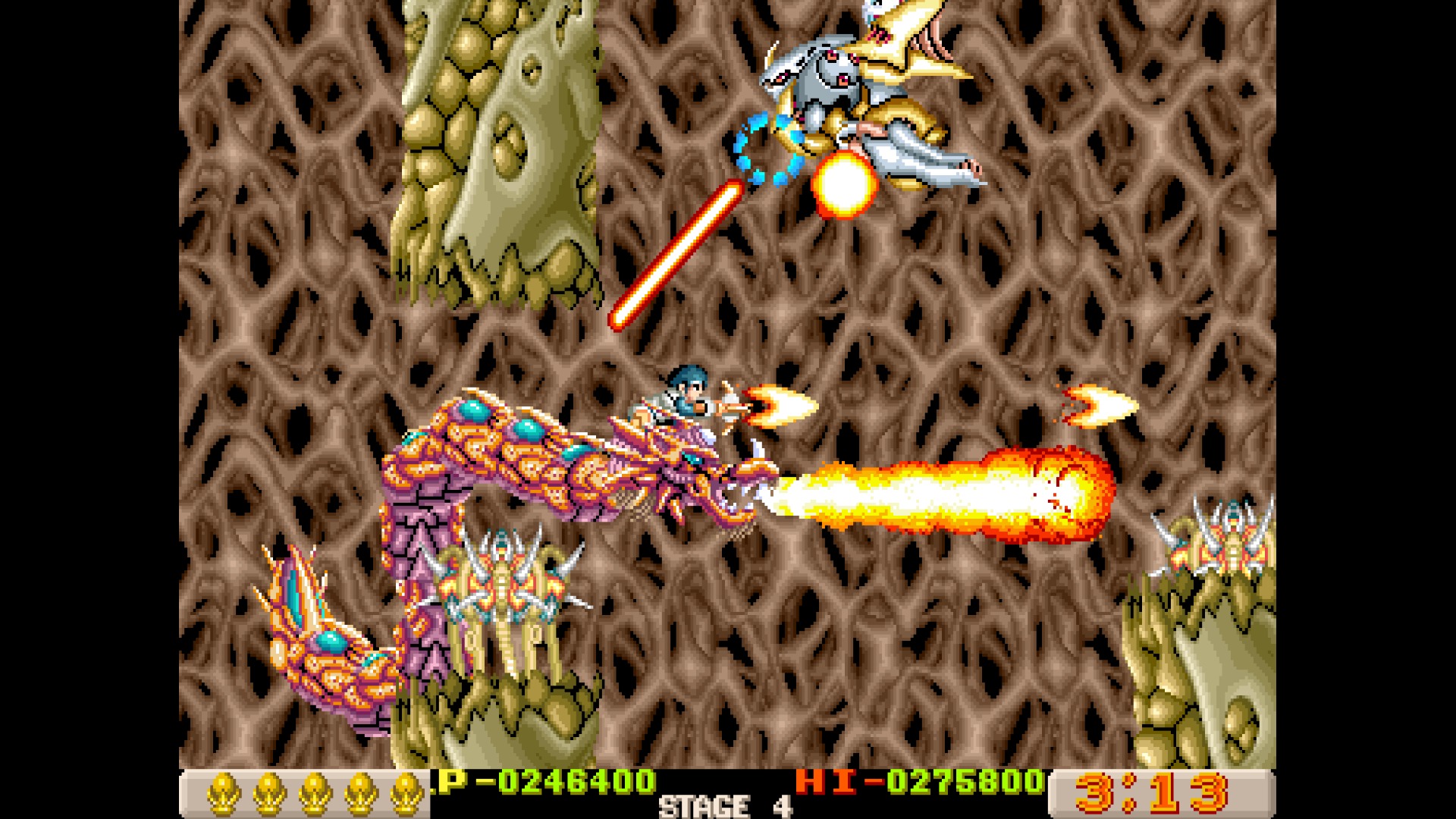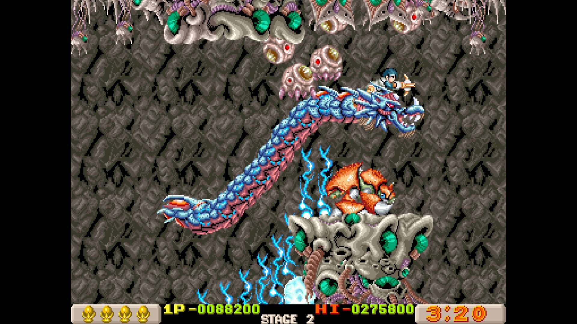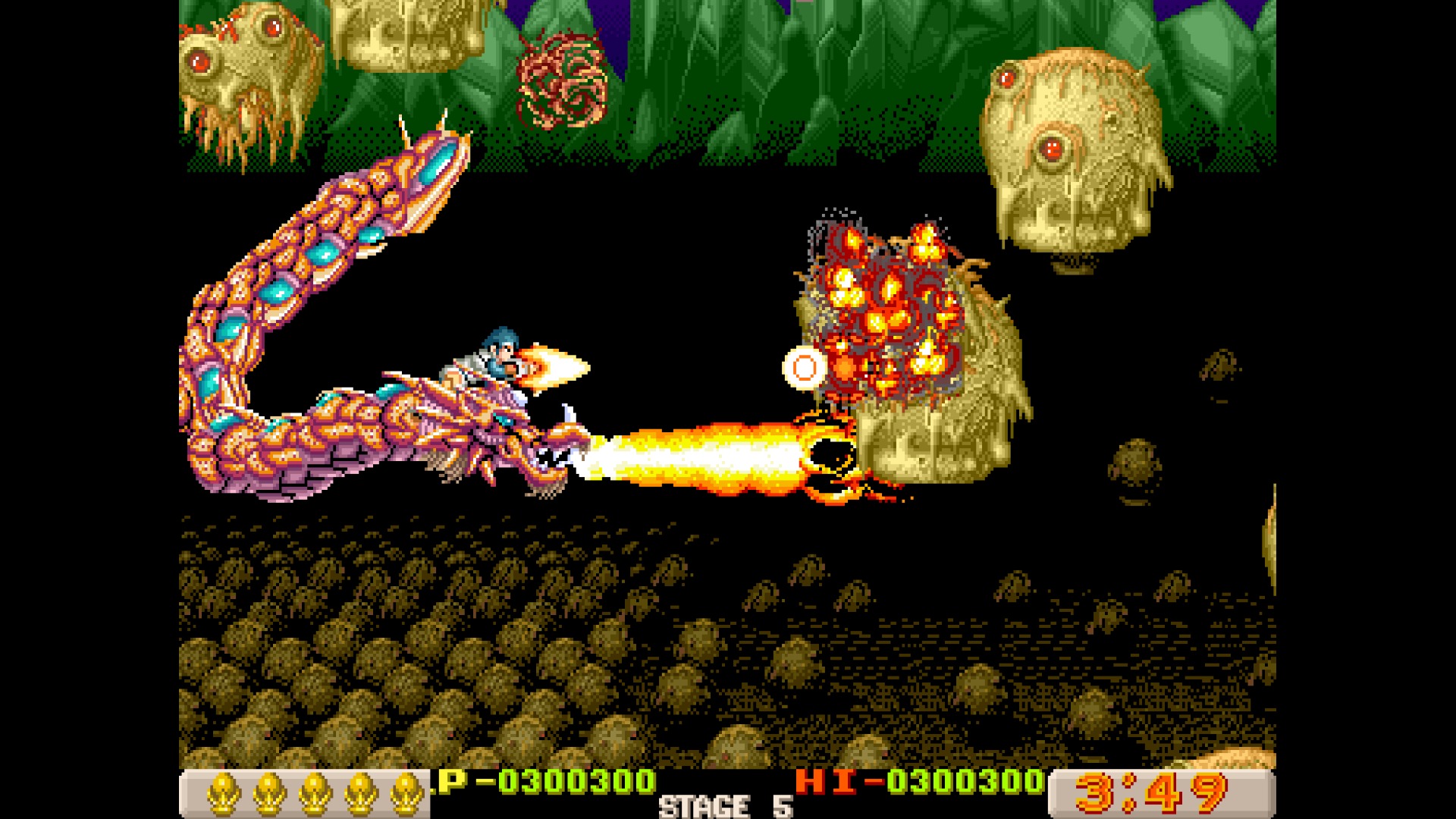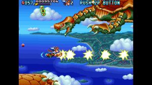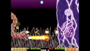 Like X-Multiply, Dragon Breed is one of those R-Type adjacent Irem shooters, which feature unique mechanics to protect your character from harm. Here, it’s the enormous multi-segmented dragon Bahamoot, who is impervious to damage and can protect its vulnerable human pilot Kayus. It’s still a tough game, as you’ll get sent back to an earlier checkpoint when you die, but taking advantage of Bahamoot’s unique capabilities helps even the playing field a bit. In addition to attacking with the crossbow, the dragon can also fire charge shots and has a handful of extra abilities, like raining lightning down from its body.