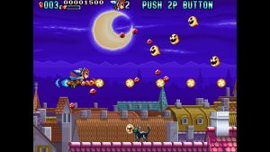 Mystic Riders takes after Success’ Cotton, featuring two broom-riding magicians as they face off against a variety of fantasy and demonic features. You can use two types of magic, which can be upgraded by grabbing gems, plus you can toss your broom like a boomerang, which can block enemy bullets.