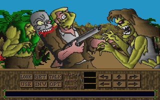 The only real reason this game seems to exist is for the numerous death animations, done in animated comic book-style format. They’re unnecessarily gruesome, and while watching a horde of zombies feast on your entrails while tossing your decapitated head to the side is a little bit goofy, quitting the game results in a scene of your character blowing off his own head with a shotgun, which verges too close to the side of tastelessness. (The video scenes are all in FLIC format in the directory, so you can watch them outside of the game if you have an appropriate media player.) Given the cheesy introduction and general scumminess, it’s clear the developers really wanted this to be more no more than a Z-grade Troma-style game, and in that way they almost succeeded, but that’s not really a high bar to reach for, is it?