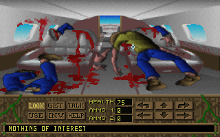 Whenever you enter somewhere that doesn’t involving shooting or exploration, it changes to the adventure segments, which also utilize a first person perspective. The only real goal behind these scenes is pixel hunting – there’s no real writing and attempting to look at the scene of bloodied, crushed bodies in the airplane crash will only be met with the response “Nothing of interest”. Looks pretty damned interesting to me! Per usual protocol, missing items in one spot will result in unwinnable situations later on and there are plenty of instant deaths. The first weapon you find is booby trapped with an explosive, and it will blow up in your face if you fire it without oiling it.