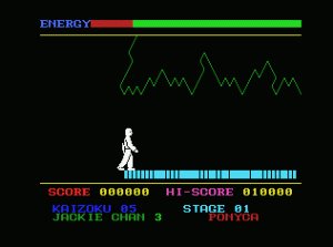 While the movie was groundbreaking at its time for the incredible stuntwork, martial arts action and production values unheard of in a Hong Kong movie, the game is sadly not as breathtaking. You control Ma as he infiltrates the cave of the pirate king San-Po, which is taken from the final act of the movie faithfully enough. The game plays a bit like Karateka, as you walk along left to right, fighting pirates and flying bats. On the screen, the Kaizoku (Pirate) counter displays how many are left on that stage.