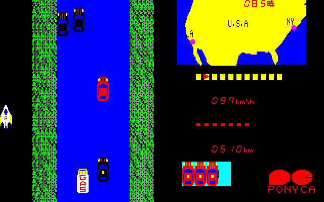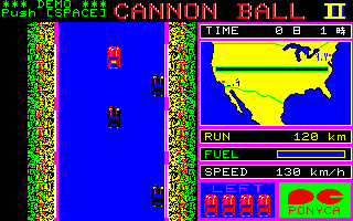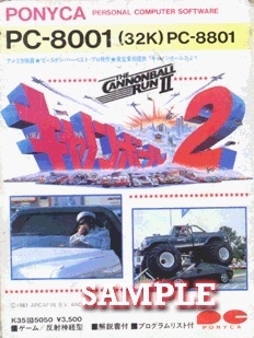 The very first game to be based on Jackie Chan is Cannon Ball 2 on Japanese 8-bit computers. The game is inspired by the 1984 all-star movie Cannonball Run II. The game is a simple arcade racer popular at the time where you drive upwards avoiding other cars along the way. As in the movie, the primary goal is to race across America in an illegal cross-country race, and you must pick up fuel tanks along the road before you run out. There is also a timer on the top right ticking down as you go along the straight roads of the USA. While some might find it a stretch that this game would be based on Jackie in particular as the movie itself starred so many famous contemporary figures, the movie was promoted as a Jackie Chan movie in Japan, and Pony Canyon had the rights to Chan's image, even though the game itself makes no mention of him.