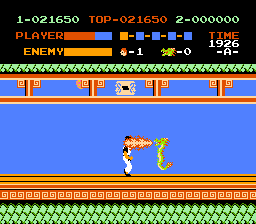 The biggest problem is the incredibly stiff controls. Like Karateka and IK+, you push directions to do different moves. You have the standard punch, kick, and a Double Dragon 2-style back-kick for when you fight multiple pirates from both sides. Here lies another problem - the pink boat boarders gang up on you constantly, and your timing must be spot on to hit them. The bats fly at different altitudes and come at you at the same time, leading you to be swarmed by them as well. When you face the pirates, the sprites start flickering and you have no control over where they are or how many you are fighting at once, and you'll find yourself dying without knowing exactly what happened. Once you have knocked down the pirates, you have to duck down and stab them for them to die. This finishing touch is taken from the movie where Yuen Biao ambushes the pirates and stabs them to death.