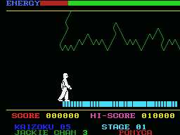 While there have been several console and home computer ports, the versions that retain Jackie's likeness are the Japanese arcade, Famicom and European NES release. While the Arcade flyer simply lifts the movie's promotional poster, the Famicom uses original artwork drawn in a rather comical style with an obvious Jackie Chan looking character.