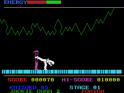 While the movie was groundbreaking at its time for the incredible stuntwork, martial arts action and production values unheard of in a Hong Kong movie, the game is sadly not as breathtaking. You control Ma as he infiltrates the cave of the pirate king San-Po, which is taken from the final act of the movie faithfully enough. The game plays a bit like Karateka, as you walk along left to right, fighting pirates and flying bats. On the screen, the Kaizoku (Pirate) counter displays how many are left on that stage.