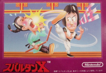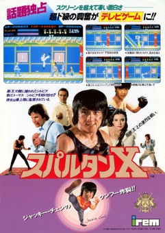 In the West, we all know this game as Kung-Fu Master or Kung Fu. And it might be even more confusing that the game itself is so apparently based on a Bruce Lee movie. Wheels on Meals, a fan favorite among most Jackie Chan fans, was released in Japan as Spartan-X. At the time of the release of this game, Jackie had surpassed Lee's fame in Asia, and Spartan-X had just come out in theatres. Towa Promotions, who were promoting the film in Japan, decided to licence the name of the movie to this game and tie in with the release. The end result led to a rather confusing cross between Game of Death's story and setting, and Spartan-X's name and Jackie's appearance.