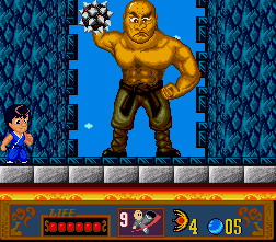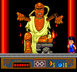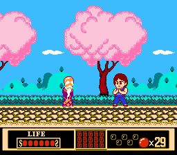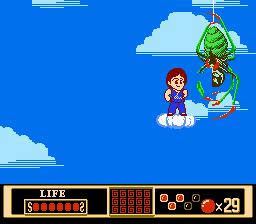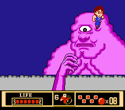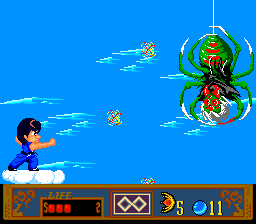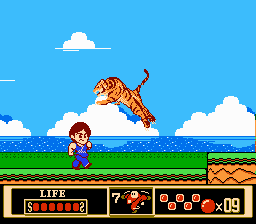 Graphically it's one of the nicest looking games in the NES library, with tons of style, fluid animation, big detailed sprites and colorful vibrant backgrounds. The chibi style art lends itself well to the comedy of Jackie, and the game feels very rich and thorough. The controls are quite responsive and it never feels delayed or awkward, and the lightness of Jackie can feel reminiscent of Adventure Island. At times, however, it does suffer from some severe sprite flickering, especially on the last boss, and at times the bosses are virtually invisible for exteneded periods of time due to this, leading to some frustrating battles.