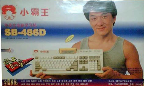 This brings us to the Chinese electronics developer Zhongshan Subor Educational Electronics Co (Zhongshan being the prefecture where they originated and Subor being Spoiled Kid in English). Subor started their company in 1987, producing knock off walkman and VHS players before venturing into the land of Famiclones. The clone systems they developed were nothing out of the ordinary or special compared to the countless others on the market, often being an exact replica of the Famicom console unit. Eventually however they would be in the forefront of releasing the more interesting Famicom keyboard clone systems. Unlike the official Famicom keyboard that Nintendo released for use with Family BASIC, these were built similarly to how the MSX was before it with the system being built into the keyboard itself holding a cartridge slot and controller ports. While there are many Famiclone keyboards today, from the little research that is possible in the field, it seems Subor was one of the very first to develop them as early as 1992. The company also saw success beyond the Chinese border, with them being a huge publisher in Russia as well. Subor differed from many other knock off companies in that they didn't shy away from publicity, and spent great amounts of money to promote their brand on CCTV, the biggest station in the mainland during the start of the 1990s. Due to Subor's efficiency and wide distribution, they eventually had the budget to hire famous Asia based stars and starlets as their spokesperson, often choosing the latest teen pop wonder or Asian beauty queen. In 1994 however, the star they hired was Asia's number one star, Jackie Chan.