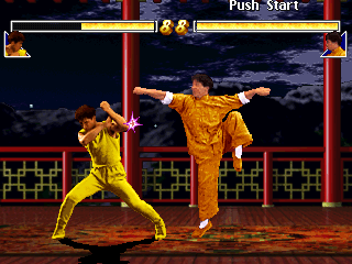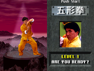 In single player you go through 9 stages. Every third fight you encounter, you're allowed to fight Jackie himself. The first form you face is the Five Animal Style form, and as you enter the fight the game plays a small video clip introducing the stage. During these fights no blood whatsoever is shown, and only Jackie can do "fatalities," though all of them are lighthearted and non-violent, like transforming you into a chained dog that goes to sleep or shrink you down to pea size. As you progress through the game you'll eventually fight him with the Drunken Fist style and finally the Bagua Zhang style. Once they're beaten you have finished the game, but don't expect any fireworks. While you do get these short animations of Jackie punching the screen each time you beat him, you get nothing spectacular for actually completing the game. First a picture of Jackie with 2 shadowy figures in the background shows up with the text "To Be Continued" displayed and then you see your fighter in his victory stance with a message to the player: