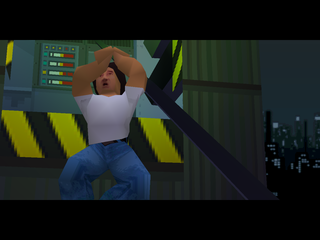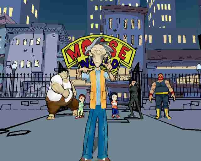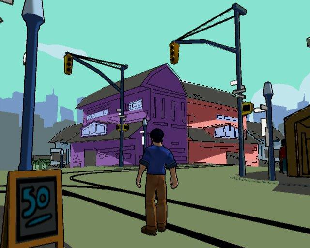 The stages are quite large as mentioned, with some vast open areas and some are quite nice looking at the beginning of the game. However its distinct visual style becomes its own enemy as you progress further. As in the TV show the backgrounds are extremely simplistic, often being just a solid color with some crayon doodles. When you watch TV, your focus is aimed at the onscreen action and camera angles, but in this game you effectively work with the scenery, making some areas look like you just stepped into the "Money for Nothing" music video by Dire Straits. The towns are also quite dead with the few people around repeating lines over and over.