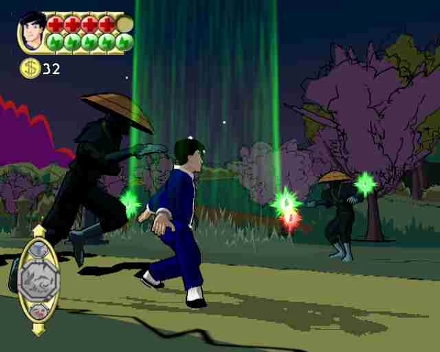 The storyline is based on different episodes across the 2 first seasons of the TV show and lets you control Jackie through them freely across larger levels. Unlike the GBA game, the moves Jackie can pull off bear some resemblance to real martial arts, though there are many super moves which definitely defy the laws of gravity. Jackie can also find talismans that give him special powers, but at the price of draining your chi level. To regain the lost energy you pick up green orbs much like in Jackie Chan's Action Kung Fu. These talismans are obtained as you clear stages and will give you powers like extra speed, transforming into a monkey, super strength and invisibility.