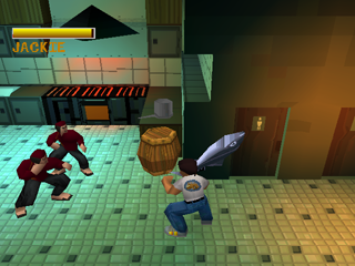 The game plays like a mix of Final Fight and Crash Bandicoot, with plenty of brawling thugs to beat and platforming sections where you pull off death-defying leaps and acrobatics. Jackie has a rather large arsenal of moves, which comes in handy in all the fights you encounter. The square button triggers a flurry of punches, the triangle button gives you some kicking action, circle grabs your opponent and the L1 button counters enemy attacks. At the press of an attack button, you start pulling off combos as you continue tapping, and you can experiment combining button presses in order to prolong the combo. This is really the key as to why the brawler part of this game works so well: because of the ease of pulling off long, satisfactory combos that effectively keep your opponents back. They are also timing-based, so attacks will change depending on when you mix the button presses which makes the brawling a bit deeper than just merely mashing buttons. Enemies come at you mostly 3 at a time and aren't overly aggressive, which gives you time to roll around the environment and plan out your attacks. In addition to combos, you can also hold down either of the buttons to do a charge move, the backflip kick which allows you to juggle the enemy or the drunken fist, which will temporarily stun your opponent.