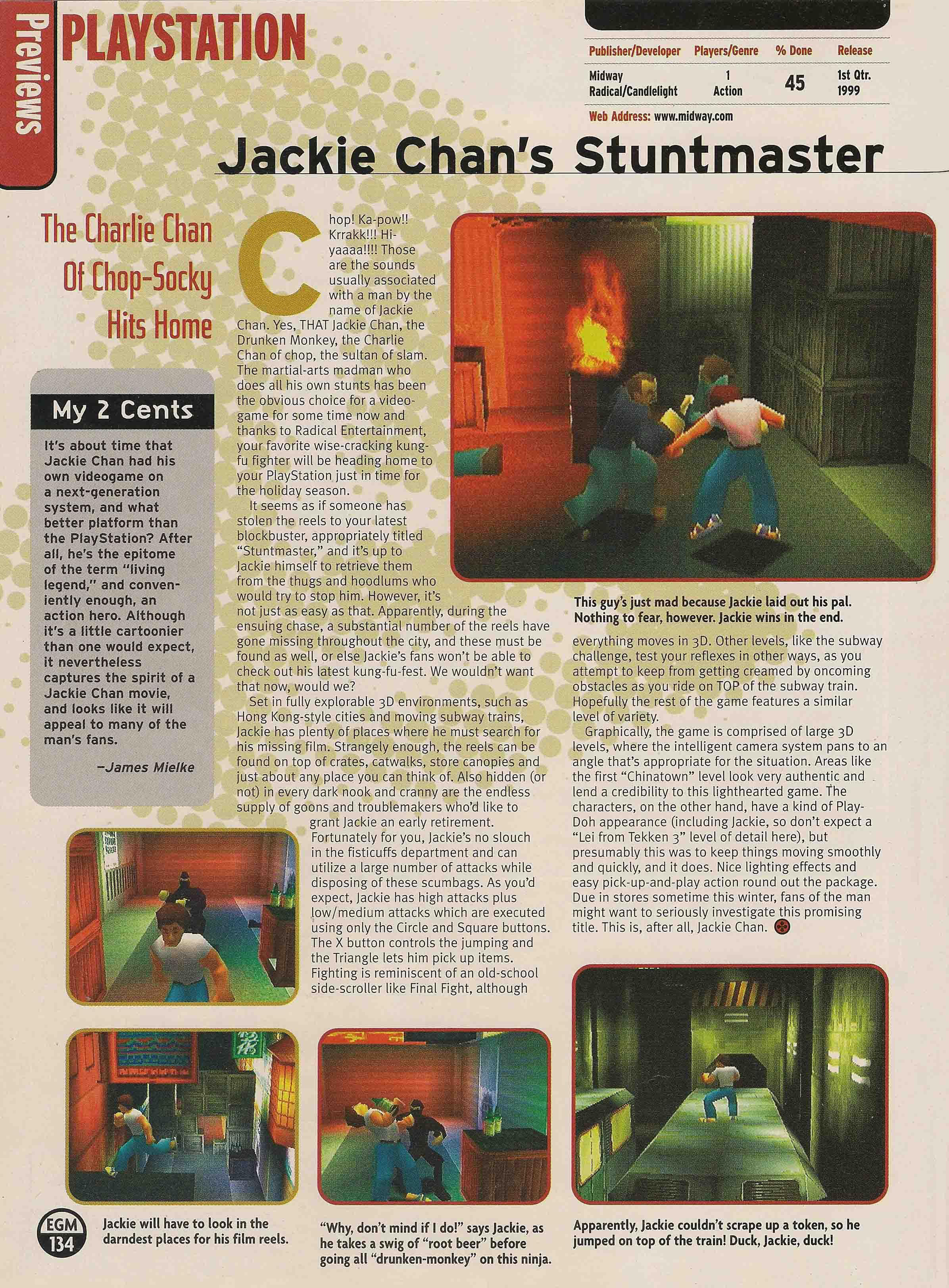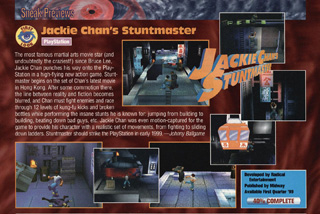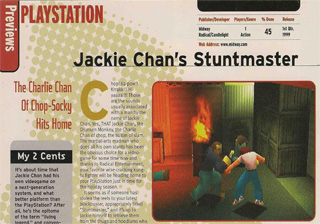 After a 5 year absence from the video game market, Jackie once again returned to do motion capturing on a new title based on him. In 1999 Radical Entertainment started work on their new title Jackie Chan Stuntmaster which set out to be the most authentic Jackie Chan experience so far in a video game. Radical didn't have many well known titles under their belt at this time, and their catalog consisted of many ports like Mario Is Missing on the NES and some lesser known sports titles. They brought Chan in to provide all motion capturing for his in-game character and also to record the dialogue.