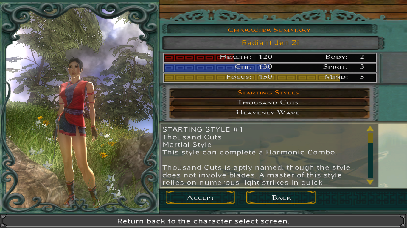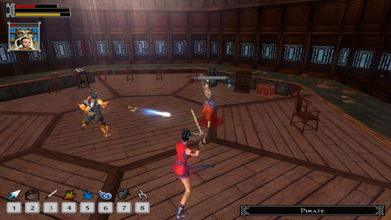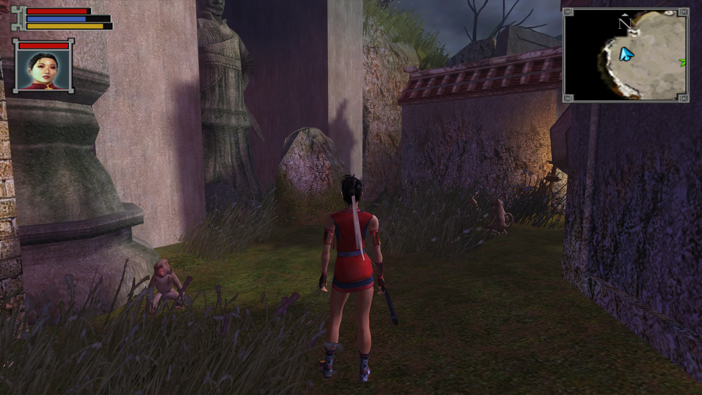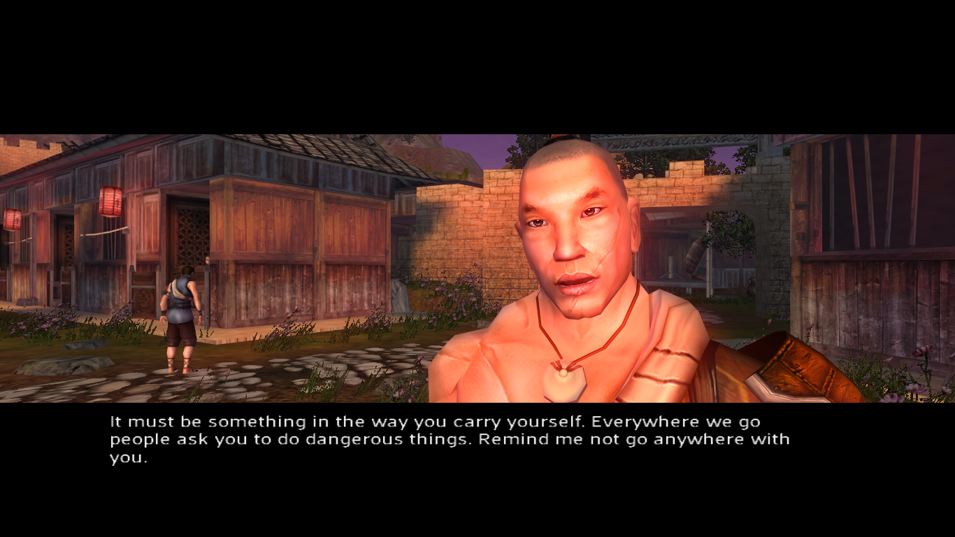You may have noticed that for the battle companions, there is no description of their role in the party during combat. This is because Jade Empire makes every party member who fights with you basically the same in function, making their inclusion solely cosmetic and to decide what flavor of peanut gallery you want in conversations. Pick anyone, doesn’t matter. You’re spirit monk is the only one who levels up, allowing them to put points in body (HP), spirit (chi), and mind (focus bar). They also affect various conversation skills, each decided by a main stat and a sub stat. Equipment mainly goes to tweaking these (sold as “training” with stat affecting orbs), with the odd weapon here and there when you have the right style.