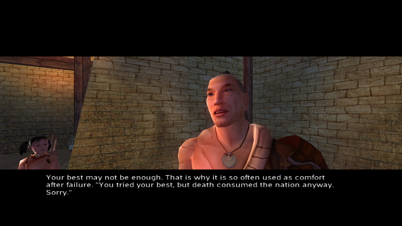 It’s a shame they recycled the binary morality system from KOTOR, because it’s even more limited here, despite the game building it up as something much more complex then it is. The game tries to build up open palm and closed fist, your good and bad moralities, as philosophies that each have good and bad variants. If you lean towards open palm, you’re collected and have a nice aura. Closed fist spirit monks get evil shadows. So yeah, same old restrictive BioWare binary morality system. Dialog options are also a bit lacking, most every meaningful choice you have either being naked greed and cruelty or goodie goodie golly gee sainthood. The rare in-between is getting to be snarky, and it is very rare.