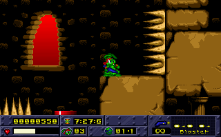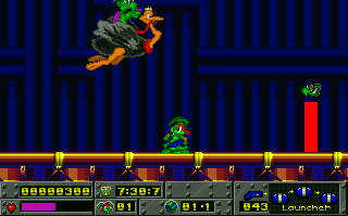 Unlike Sonic, Jazz actually has a health bar, and can only take three to five hits, depending on which of the four difficulty levels you’ve chosen. While health pickups aren’t terribly rare, you don’t have the same kind of safety net that Sonic’s rings gave you. This means that you have to play a lot less recklessly, which doesn’t really gel with a game that advertises itself as being so fast.
