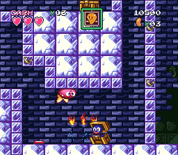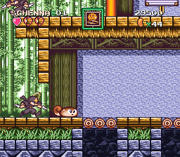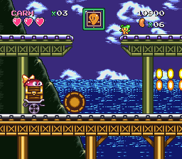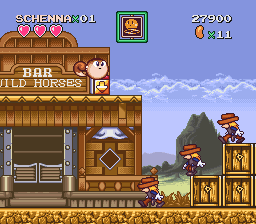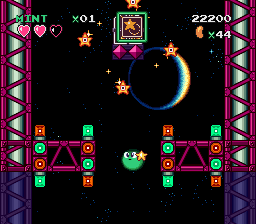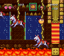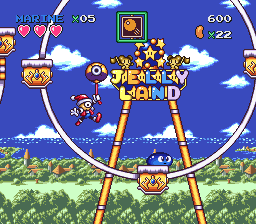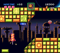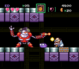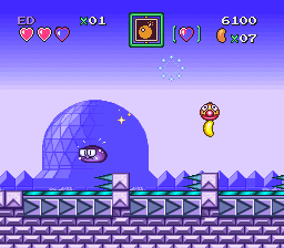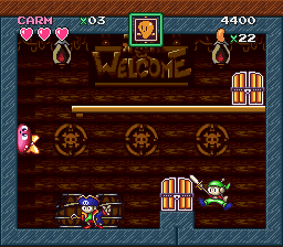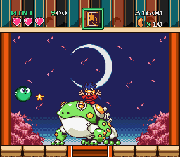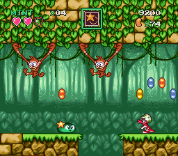 Naturally, the presentation is a step up from the original from three years prior. Each level represents a themed area a Disney-esque amusement park might have, ranging from pirates to a lost prehistoric jungle temple to a space world and even, yes, an old-fashioned Western-slash-Ninja setting. The easily-squishable mice from the first game still run rampart but are joined by many new threats – a lot of the them clown-based. Your same old wall-sliming and tube-travelling methods are back as well as you inch your way toward the exit door to the next segment of the stage. The controls have been tweaked to make climbing and dashing a smoother experience. Your attack and run commands each now have their own separate button assigned to them, no longer forcing you to waste a power-up just to hoof it faster and scurry up a ledge. The kids’ unique traits and attacks encourage varied playthroughs for the best means of tackling levels. Sadly, Yoshinori Sunahara’s music score is much more forgettable than the tracks from Smart Ball.