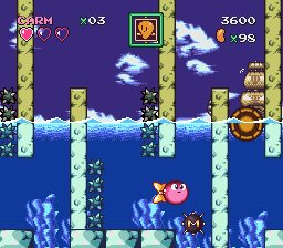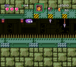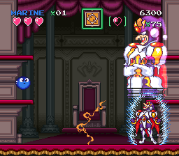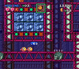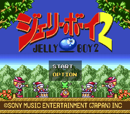 Rather than have the strict linear progression of its prequel, Jelly Boy 2 opts for a Mega Man style choose-your-stage approach with five levels open from the start. Each attraction you choose to go to is broken into five sections, usually having a mid-boss around the end of the 2nd or 3rd segment before the stage boss guarding one of Marine’s kidnapped companions. Each slime saved becomes selectable before the start of a level, each with his or her own unique abilities. Marine is the default with the standard ball attack from the first game, now always available with a recharge timer added. His true skill is being the fastest of the group. Mint is the green-haired/green blob girl with the star in her hair, able to fling the barette like a boomerang without recharging at the cost of movement speed. Carm is the shy girl blob with the bow, having no special means of attack and is one of the slowest characters but was planned to be the fastest swimmer by using her bow as a propeller. However, the unfinished ROM as-is has her still matching the same swimming speed as the others. Carm’s only advantage left is being able to climb down from certain ceiling angles without dropping. Ed is the glasses-wearing purple blob, able to leap higher than the rest and can lay proximity bombs that can burst through certain breakable blocks most of his friends can’t. Schenna the dog blob, like Carm, has no special attack, but can hover slowly in his descent with his tail. The chubby kid-turned-orange blob York can’t jump quite as high and drops like a rock, but has a swift dash attack that can also break blocks Ed’s bombs can.
