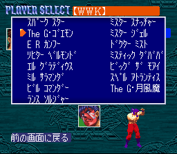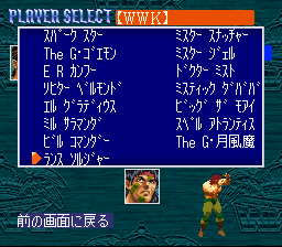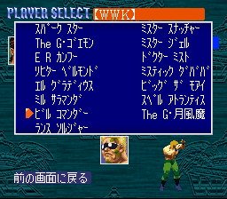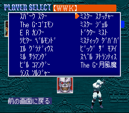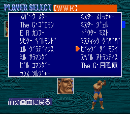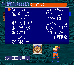 Finally, there’s the second group. This federation is called WWK – an obvious play on WWF and/or WCW. Of course you’d expect this would mean that they’re parodies of American wrestlers, but that’s not the case. Konami games are routinely chock-full of self-references, but they took it to the extreme in this case and stocked the entirety of WWK with wrestler-ified Konami characters! The sprites really just borrow the color schemes, but the character portraits on the selection screen make it pretty clear who they’re supposed to be referencing. But this aspect to the game alone should make it well worth playing for any Konami fan. Many of their names are changed, but it’s pretty obvious who’s who if you get the references.