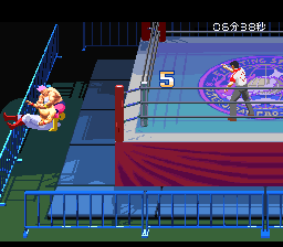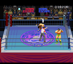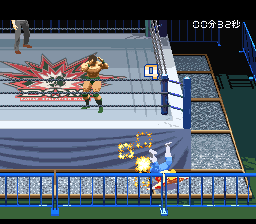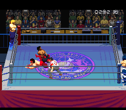 Another reason to play Jikkyou Power Pro Wrestling in lieu of the console’s Fire Pro titles is that, while it doesn’t have movesets as large as those games do, it does let you do a few really cool things that other wrestlers for the hardware don’t. You can also lean your foes back against the ropes by whipping them into them from very close range, and then pummel away on them. Before rising from a fall it’s possible to move out of the way and send an airborne rival crashing into the mat. You need to briefly rise to one knee before you can stand up fully, and you can attack the other guy while he’s still kneeling. By holding the direction toward the ropes and pushing Y, you can launch yourself into the air and bring death from above to your hapless foe. Where this differs from the SFC Fire Pro titles is that you can stand on the apron (the part of the mat that’s outside of the ropes) and perform the move from there against anybody who’s still inside of the ring.