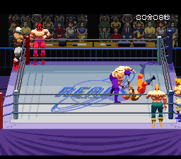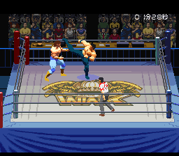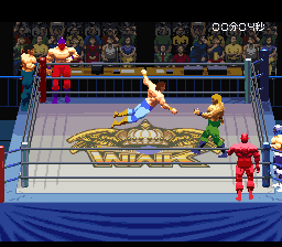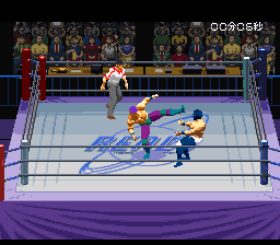 Even though there are games with more modes, Jikkyou Power Pro Wrestling has a few really interesting things that set it further apart from other Super Famicom wrestlers. There are four modes of play to choose from – “Versus” is stand alone matches, “Tournament” is self-explanatory, “League” takes a lone character through league play, and “Max Voltage” is a career mode. Then you choose from three styles of matches – standard, shoot, and death matches. If you choose to play a standard match, then you can select your character, your ring, whether or not to play a tag team match, and how many people are playing (up to four if you have the multi-tap). Standard matches work with all of the rules described above, but you can also set a time limit, turn off rope breaks (meaning that the ropes will no longer be a “safe area” from pins or holds), and turn on “lumberjack” mode (meaning that you’ll automatically re-enter the ring after leaving it). Tag team matches can be 2-on-2 or 3-on-3, and you get to control every member of your team in both modes.