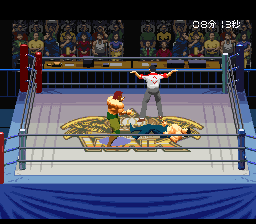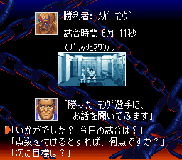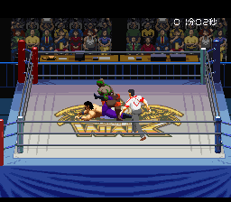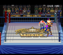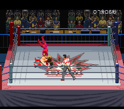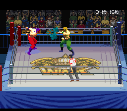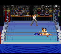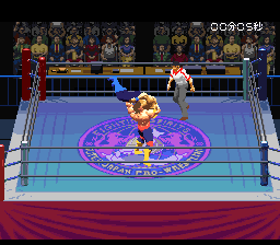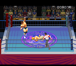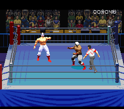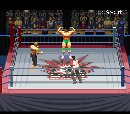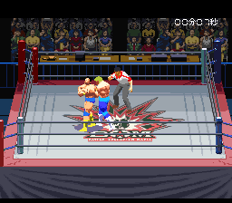 In another attempt to stand out from the crowd, Jikkyou Power Pro Wrestling uses pre-rendered graphics, but only for its wrestlers, referee, and rings. Which means that it’s basically “Fire Pro with high tech graphics”. It’s a thirty-two meg cart, so it’s obvious that a lot went into the graphics, but the resolution still isn’t very high, and many of the animations are lazy to the point that submission moves are animated with as little as two frames. Also, during matches the characters are all palette swaps of each other, but the color palettes are really well applied, so there’s a surprising amount of variation between the look of each wrestler.