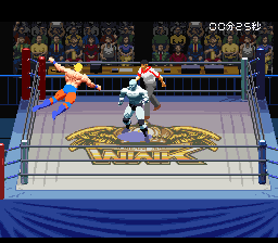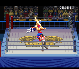 Several of the animations are damn painful looking. Like when the two wrestlers drop-kick each other at the same time, jerk to a halt mid-air, and plummet to the canvas like bricks. It’s possible for the wrestlers to bleed after injuries, and they’ll remain bloody for the remainder of the match. If a wrestler takes a face full of mist then that’ll also stay visible throughout the rest of the match. Falls make an extremely painful crashing noise that’s seriously the most jarringly painful noise in any video game that I’ve ever played. Its audio in general is excellent, and there are noises for each step on the canvas while running, and even bits of digitized audio.