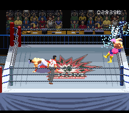 After the immense success of Human Entertainment’s Fire Pro series of wrestling games in Japan, there was a flood of wrestlers for SFC from a large variety of developers. With so many other titles in the genre available for the console, designers had to do something to make theirs stand out, so the console has a pretty diverse selection of wrestling games. There are management sims, like Super Wrestle Angels, Bishoujo Wrestler Retsuden, or Joshi Pro Wrestling Story. Then there are ports of popular arcade games, like Saturday Night Slam Masters or the kind-of-wrestler-ish kaijuu themed monster battle games King of the Monsters. Yet others just simply gave their game an official license, like ZNPW, SNPW, or JWP. There were even a few that took a wrestling theme and made it into a Street Fighter II-style game, like Onita Atsushi – FMW, Saikyou – Takata Nobuhiko, or the Sougou Kakutougi Astral Bout trilogy. Others, like Gekitou Burning Pro Wrestling, tried to do the impossible and outdo Fire Pro at its own game. Konami also took a shot at the genre with the game Jikkyou Power Pro Wrestling ’96: Max Voltage.